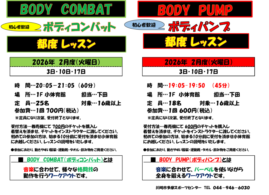 2026年2月ボディコンバット・ボディパンプ都度レッスンのご案内