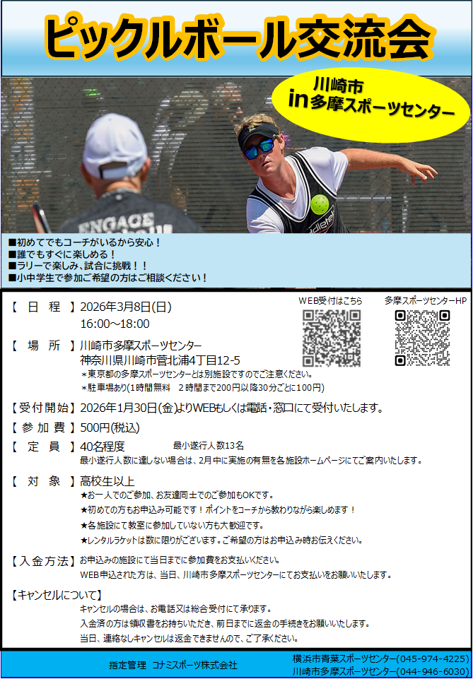川崎市多摩スポーツセンター、横浜青葉スポーツセンターでピックルボール教室に通われている方の交流戦を実施いたします。もちろん、上記施設以外でピックルボールを楽しんでいる方もご参加いただけます。